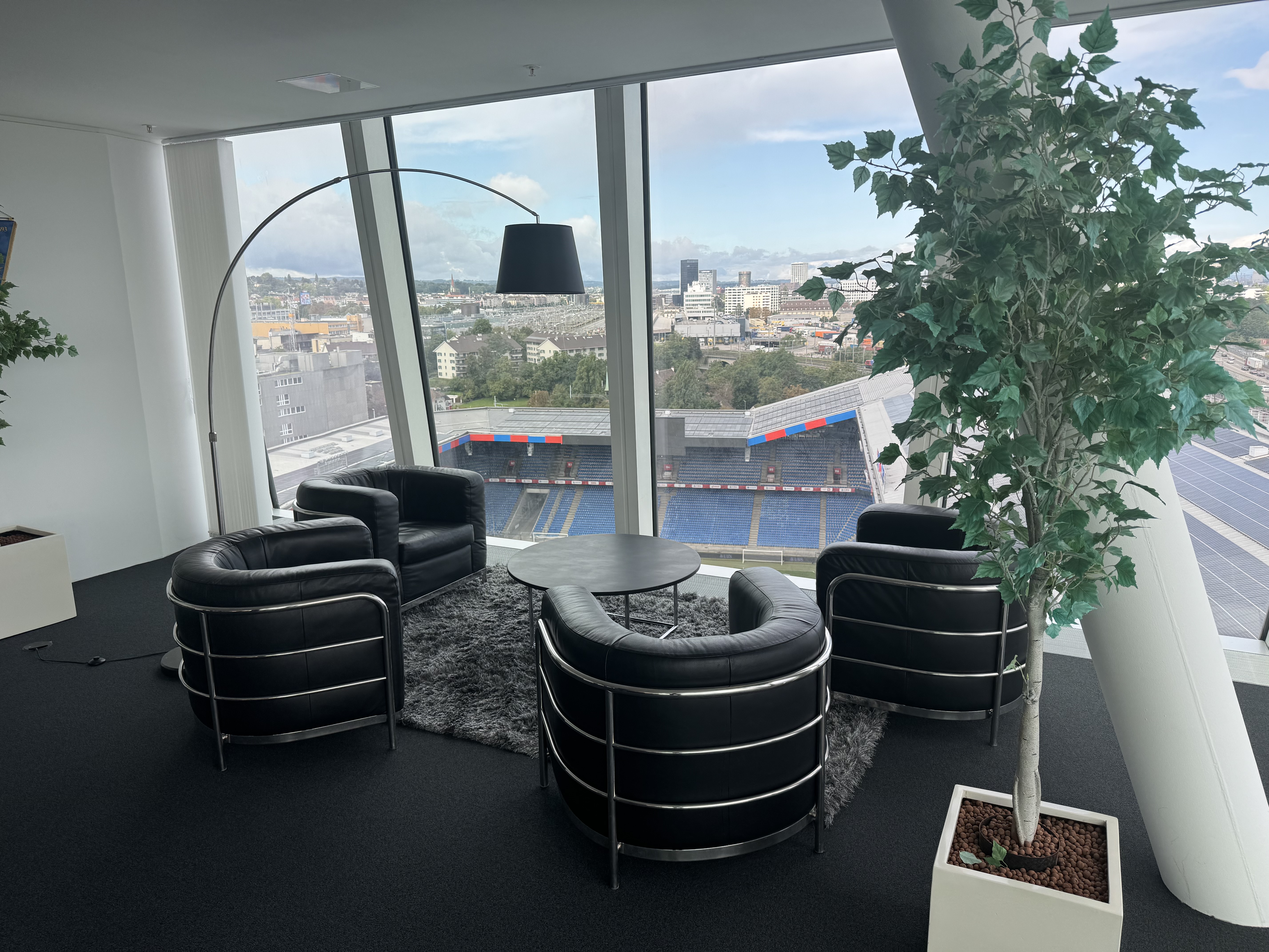Eine Oase im Glaspalast mit über den St. Jakob-Park. Hier durften wir aus einem Büro eine komfortable Arbeitswelt gestalten. Die gestamte Möbilierung der Arbeitsplätze, sowie Sitzungstisch, Küche, Lounge, Begrünungen und Reklame wurden von uns gefertigt und Montiert.